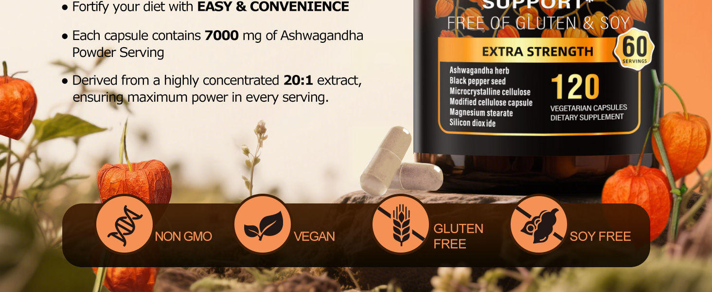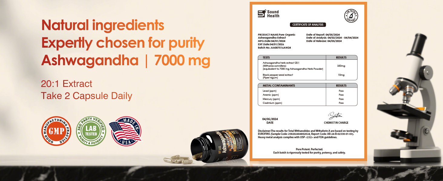 - HIGH PURITY EXTRACT>>> Soundhealth Ashwagandha contain a concentrated 20:1 extract, equivalent to 7000mg of ashwagandha powder per serving, ensuring maximum potency and effectiveness.
