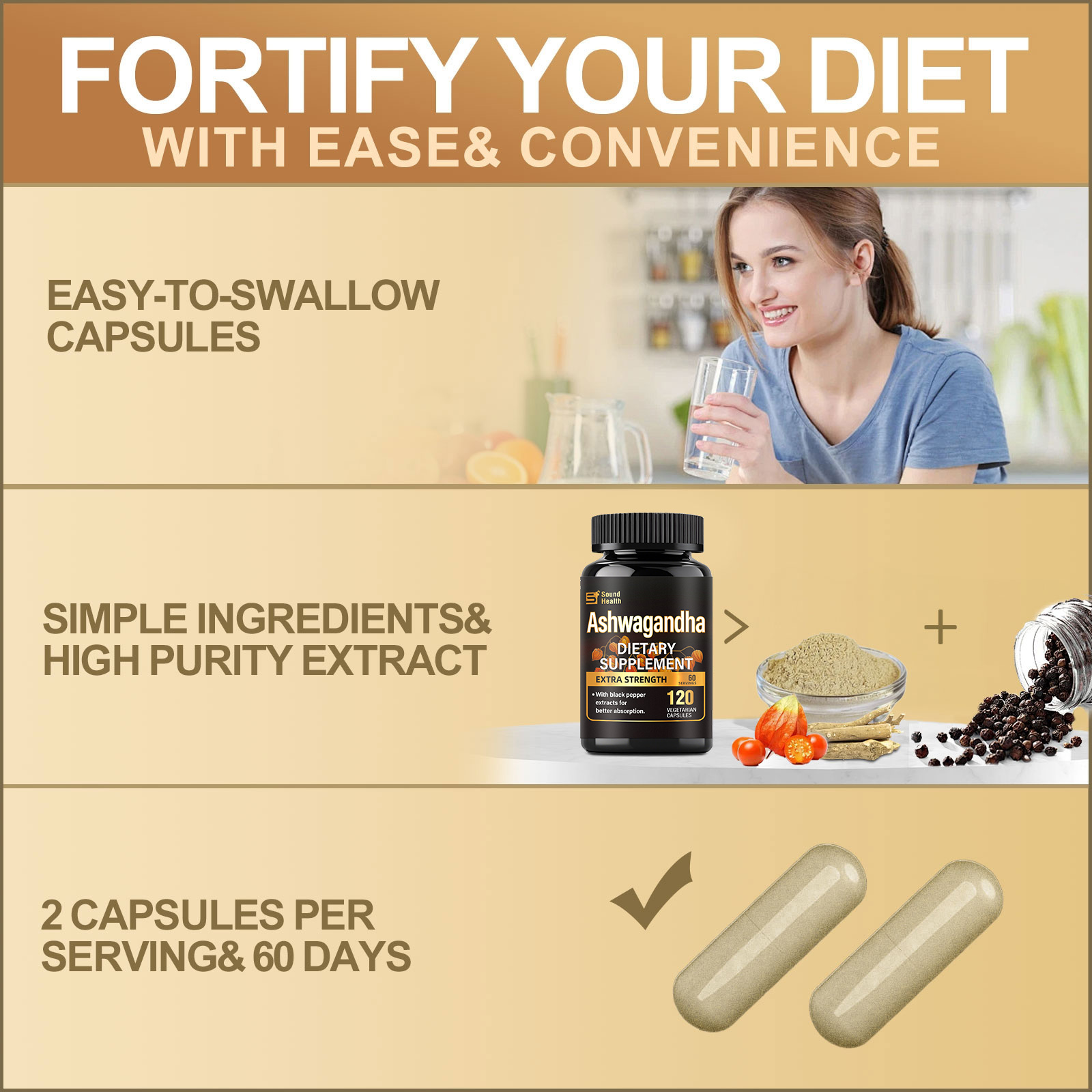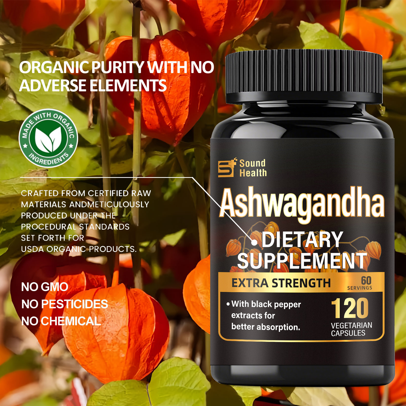 - SIMPLE INGREDIENTS>>> Soundhealth Ashwagandha extra strength contain premium ashwagandha and black pepper extract sourced from pristine environments, free from artificial flavors, colors, and preservatives. Manufactured with rigorous quality standards to ensure purity and safety.